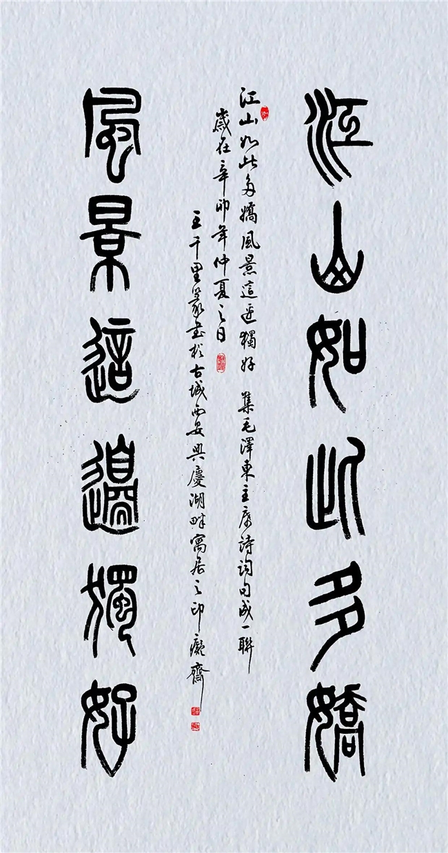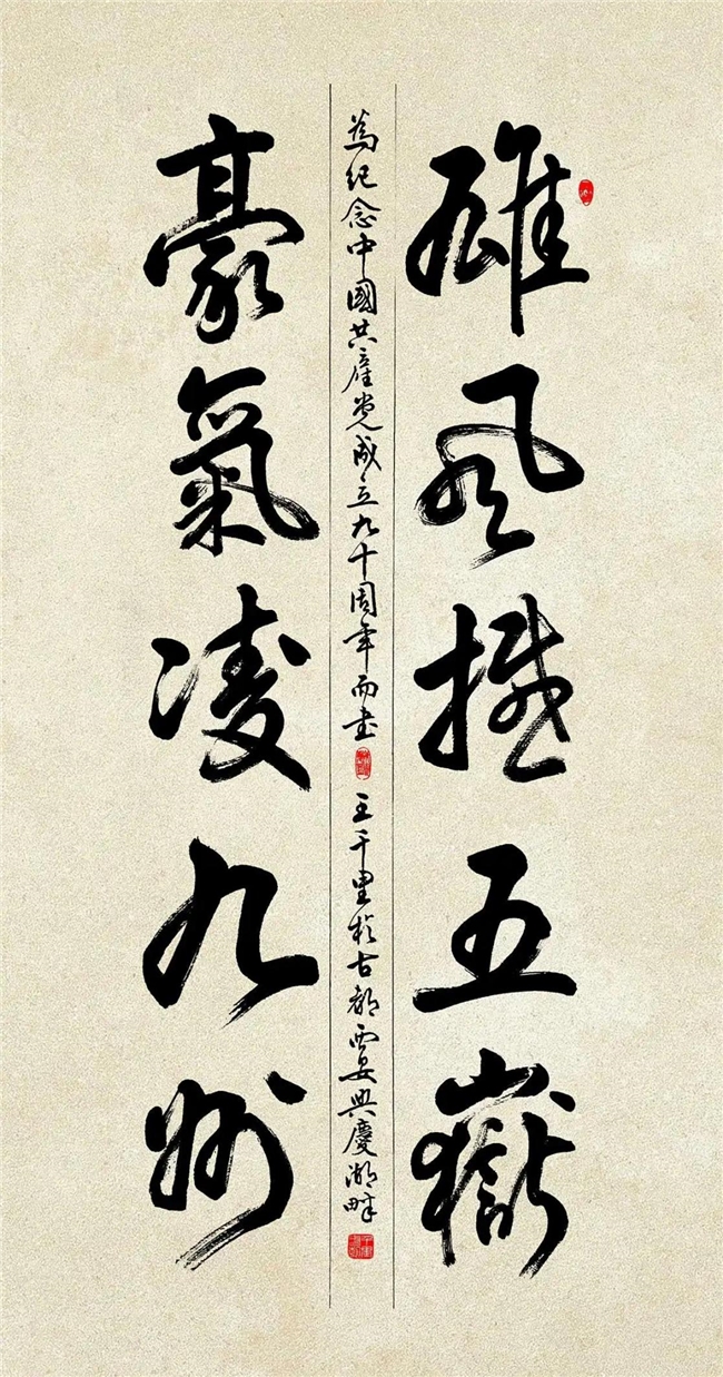 王千里,1944年5月生,祖籍陕西三原。其父曾任书法大师于右任秘书,母亲系上海法政大学高材生,家中收藏古书及字画颇丰。在家学的耳濡目染中,自幼酷爱书法篆刻;从中学时代开始拜陕西省文史研究馆馆长、著名书法家张寒杉为师钻研书法篆刻。他用心坚韧、不忘初心、师从传统、造诣颇深。即使在上山下乡插队务农期间,仍坚持不缀,练就了真、草、行、隶、篆诸体皆能的书法功底,尤擅篆书及行、草。
